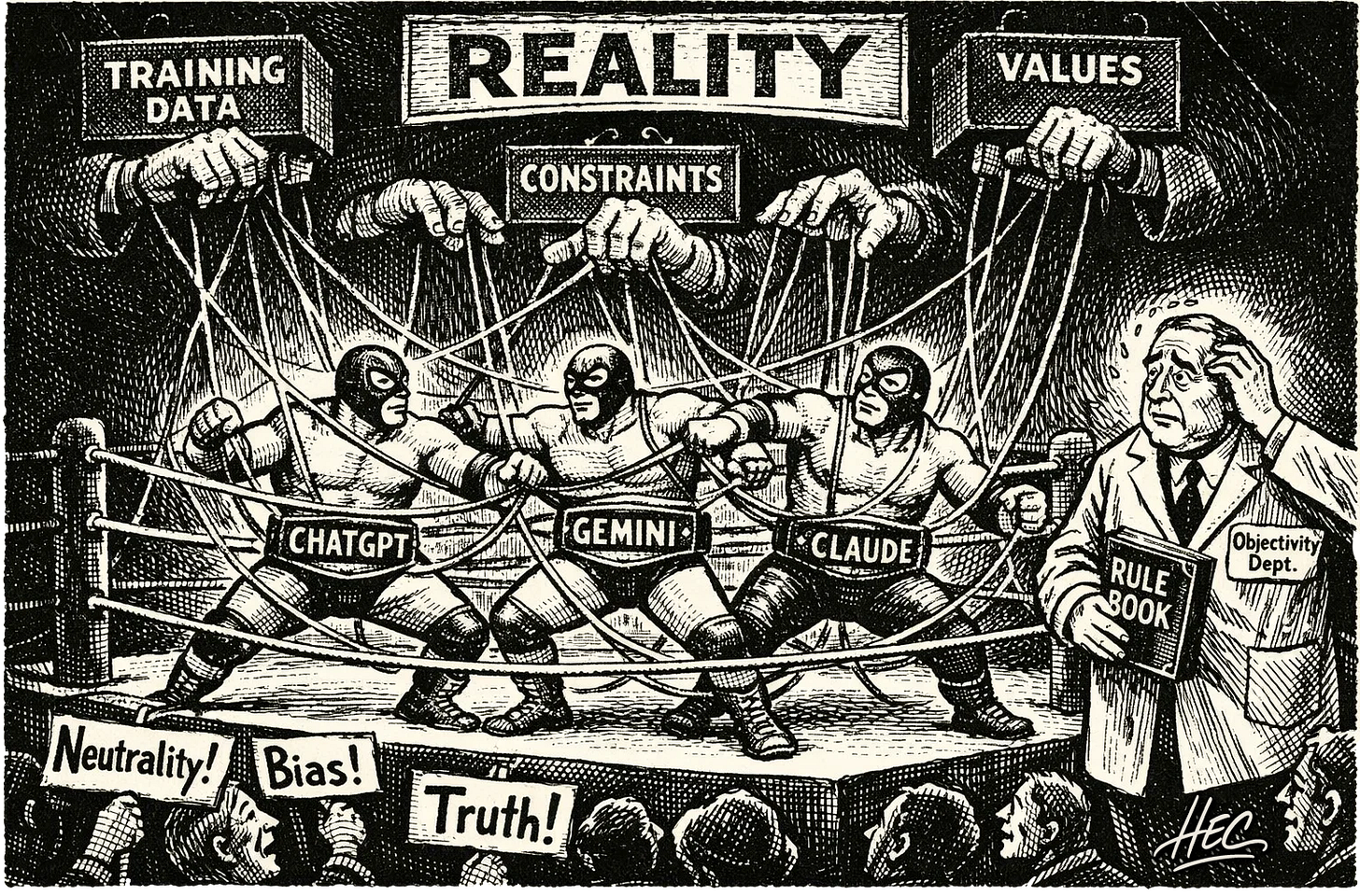 The revelation of their internal training and what they prioritize is revealing. I expected similar subjects and small stylistic differences; instead I got three different ontological entry points.