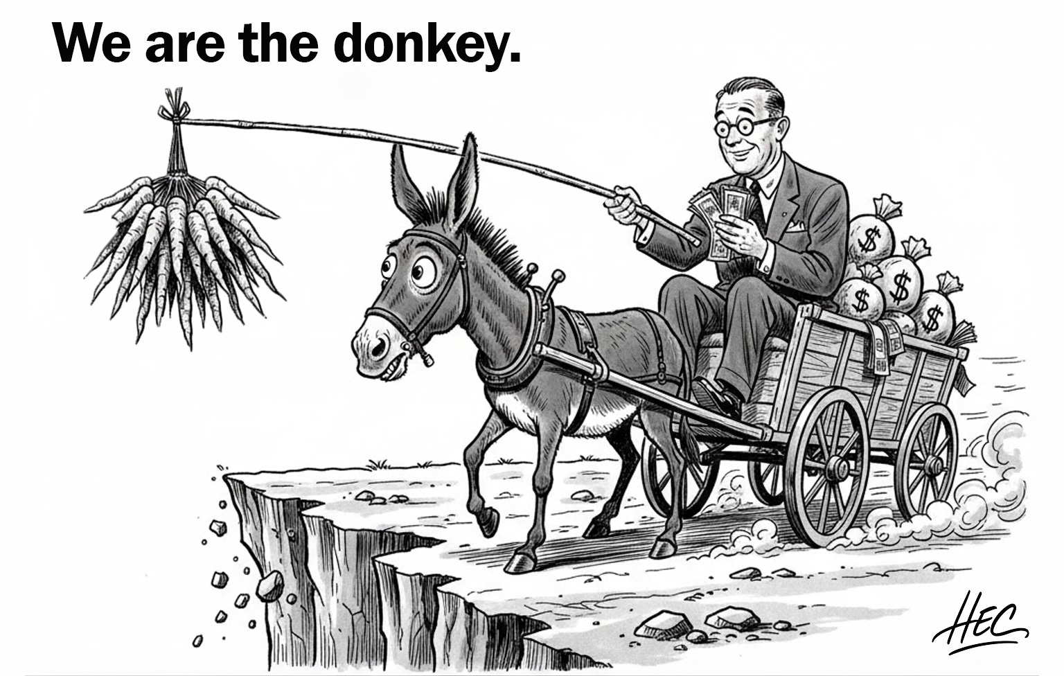 Today we are distracted in the same way. We argue about the wrong things while the unintended engines of power consolidate without friction. And just as in 1862, we – ordinary citizens, not the powerful l– are the ones pulling the cart forward, chasing the carrots we ourselves crave.